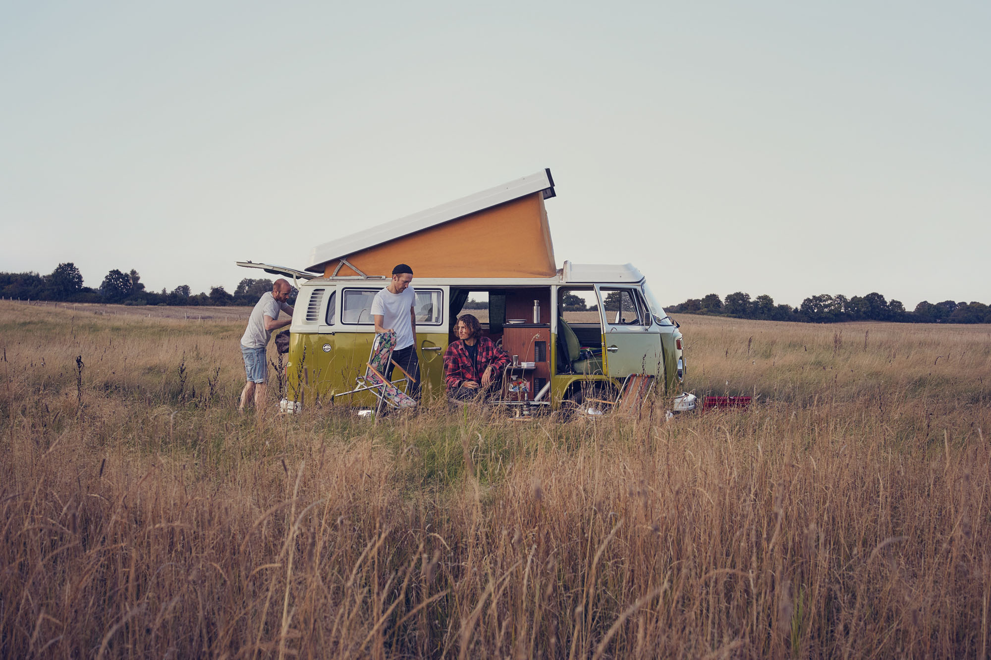 Mit einer solchen Liebe dauert es in Hamburg nicht lange, bis man Bulli-Freunde findet. Die Camper mit den Surfbrettern auf dem Dach stehen in vielen Straßen, an der Ampel lächelt und winkt man sich zu, bald war ich Teil einer kleinen Bulli-Gang. „Kottens“ Garage, eine alte Hinterhof-Remise, wurde zu meinem dritten Raum. In dem alten Holzverschlag stehen fünf Busse, vier im gleichen Alter, nur einer mit Motor vorn. Vom Schrauben-Gerd bis zum Toastbrot-Wilden haben wir alle Typen und Typinnen dabei und viele weitere in einer gemeinsamen WhatsApp-Gruppe. Wir teilen uns Werkzeug, Grube, Couch und Kühlschrank und rücken regelmäßig zu gemeinsamen Großstadtfluchten aus. „Bin um neun an der Scheune am Schaalsee – jemand Bock?“ Das reicht als Ansage und Vorbereitung. Denn in den Bullis liegen unsere Zahnbürsten, Kopflampen und Schlafsäcke immer bereit. Vielleicht noch ein Kartenspiel. Oder etwas Brennholz. Einen Stellplatz finden wir immer bei irgendeinem Bauern, und dann machen wir den Huntington: Lagerfeuer an, Fisch drüber, Sterne gucken, klönen bis spät in die Nacht. Natürlich funkelt nicht alles so wie auf Instagram. Unser Fisch ist nicht selbst gefangen, die Milch nicht von der Kuh gezapft, und irgendwann fängt es immer an zu regnen. Erst neulich musste uns ein Landwirt aus dem Schlamm ziehen. „Nächstes Mal campt ihr besser am Jungfernstieg“, sagte er zum Abschied.